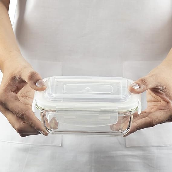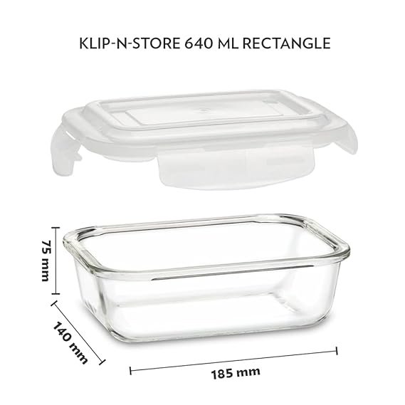 Borosil Klip N Store Glass Storage Container For Kitchen With Air-Tight Lid, Microwave & Oven Safe, Rectangular, 640 ml, Clear