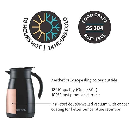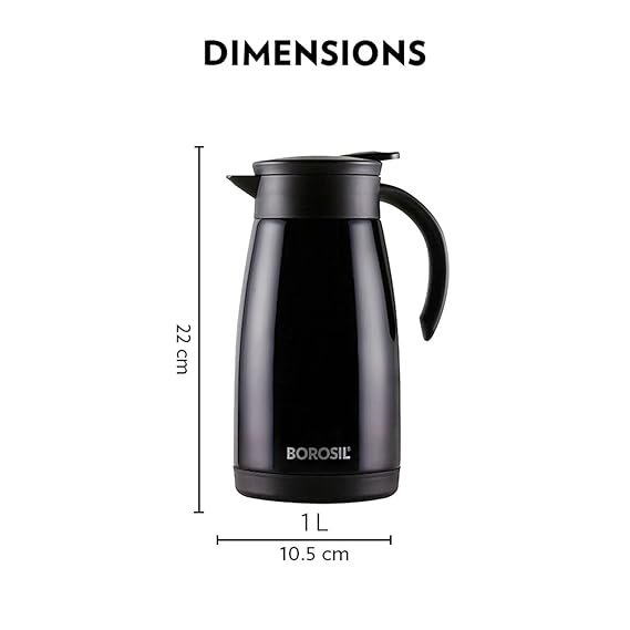 Borosil Stainless Steel 1000ml Teapot with Handle | Double Wall Vacuum Insulated Thermosteel Carafe | BPA Free Jug for Tea/Coffee & Juice | 18 Hours Hot & 24 Hours Cold | 1 Year Warranty, Black