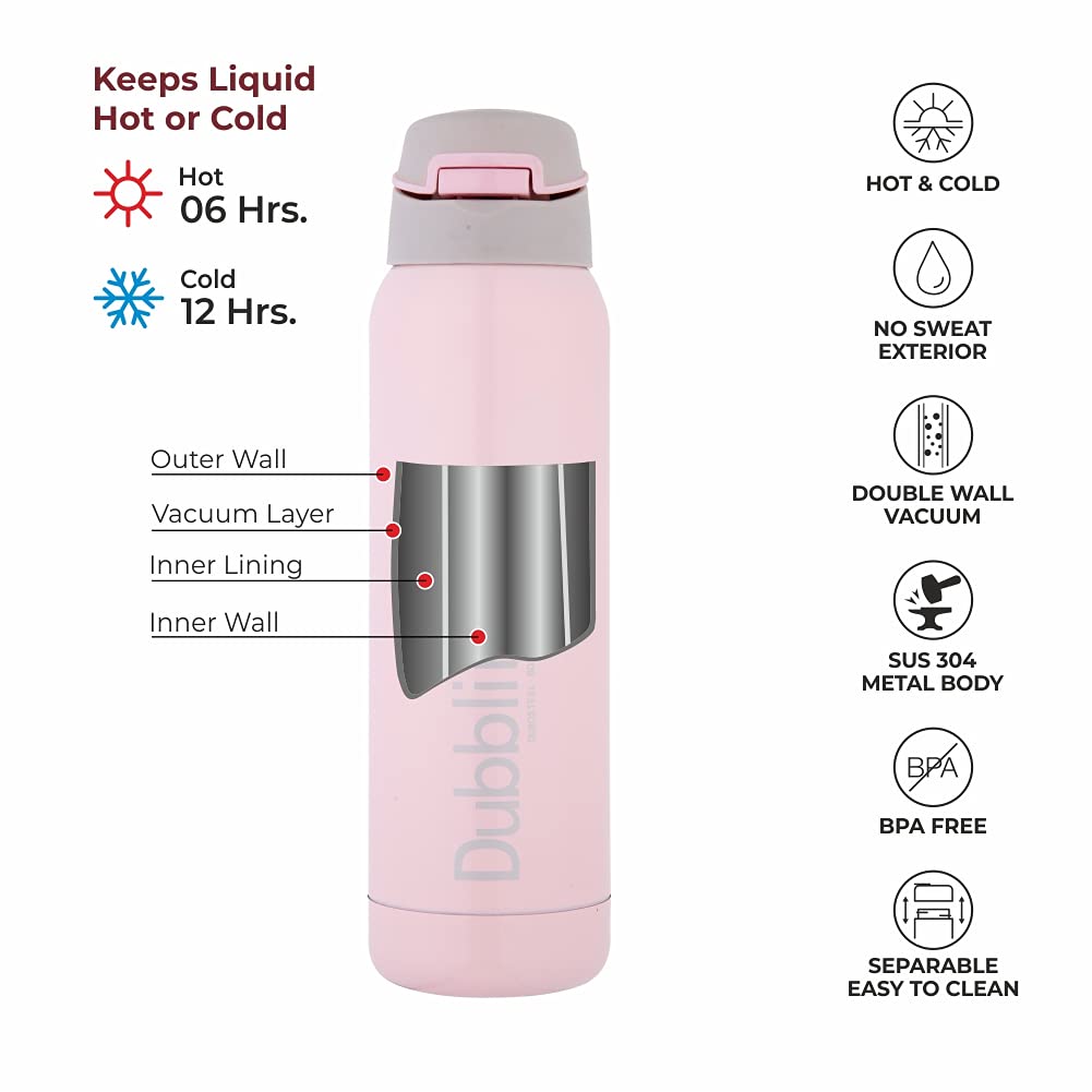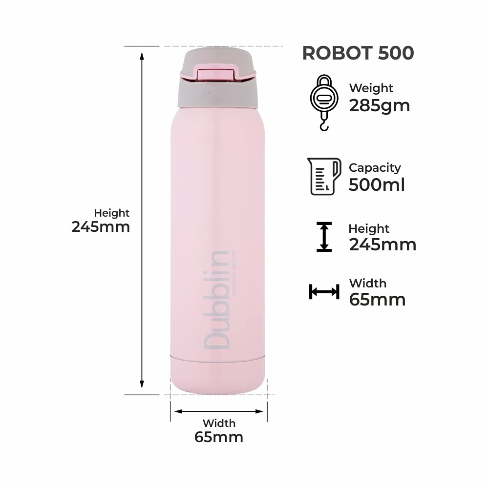 Brand ‎DUBBLIN Capacity ‎450 Milliliters Colour ‎Pink Special Feature ‎Sweat resistant, Leak proof, BPA free, Anti slip bottom, Insulated Age Range (Description) ‎Adult Item Weight ‎257 Grams Material ‎Stainless Steel Number of Items ‎1 Pattern ‎Solid Included Components ‎1 pc Bottle Product Care Instructions ‎Hand Wash Only Cap Type ‎Flip Straw With Lid ‎Yes Manufacturer ‎DUBBLIN, Sona Enterprises 2673, Sadar Thana Road, Delhi – 110006 Manufacturer ‎DUBBLIN Country of Origin ‎India Item model number ‎ROBOT 500 ASIN ‎B09B42F5PV