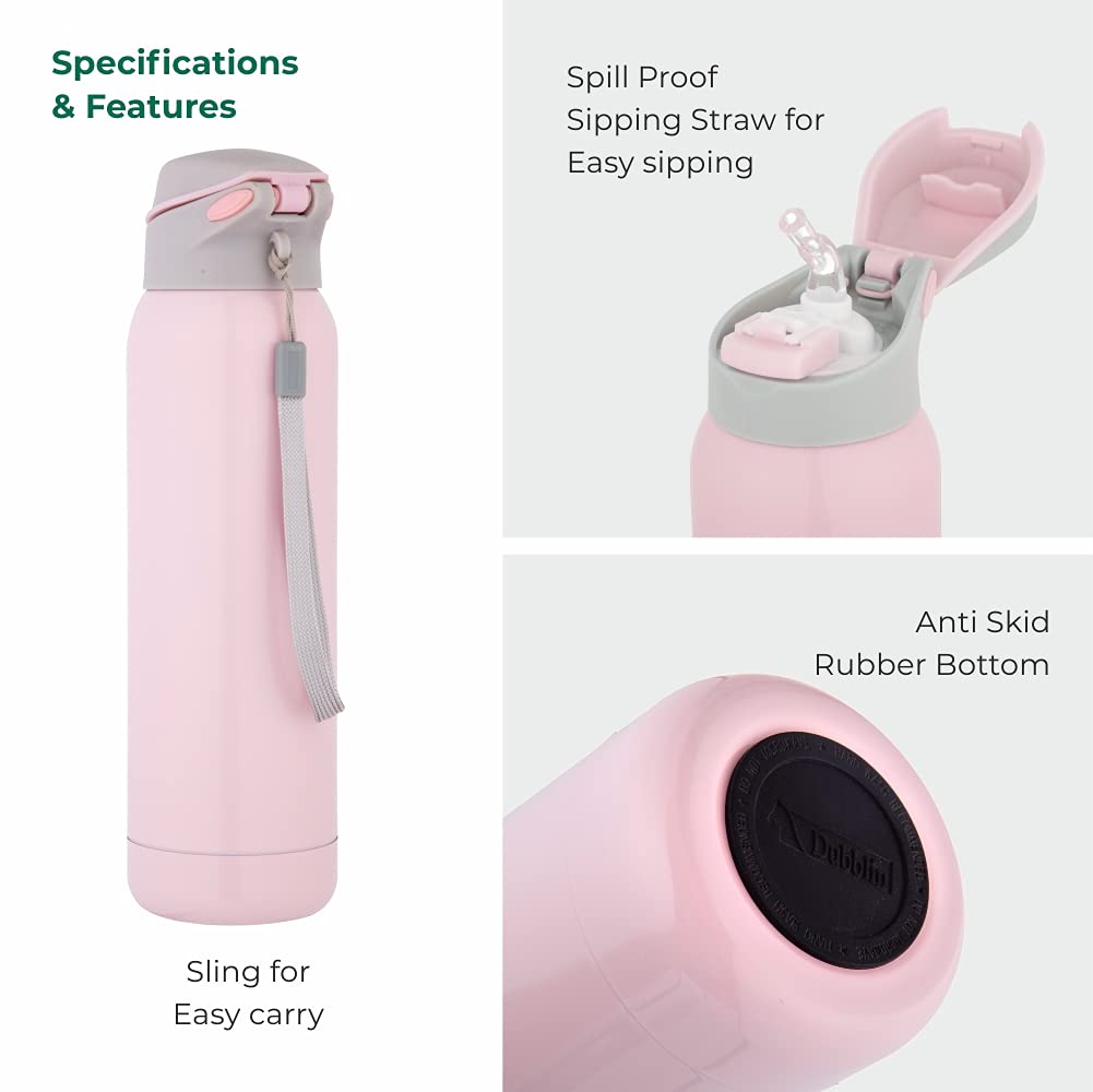 About this item Material: Stainless steel 304 grade; Insulation Type: Double Wall Vacuum Insulated Water Bottle Capacity -450 ML, Inner and Outer side of Bottle is Made from 304 Grade Steel Which is Rust Free and 100% Food Grade. Vacuum Insulation Technology Locks in Temperature to Preserve Flavor and Freshness to Keep Beverages Cold for up to 12 Hours and Hot upto 6 Hours. Perfect Size, Easy to carry , Condensation free and Leak Proof Lid. Sling for easy carry, Spill proof with sipping straw and Anti-Skid Bottom. BPA-Free & Toxin Free -Easy to Clean -Use Mild Soap for cleaning the Flask and advised to be kept open when not in use to avoid odor Ideal Usage: Used for Outdoor Sports, Gym, Work Trip, Home, Office, Home, School, Travel, Trekking, and in All kinds of Sports Activities.